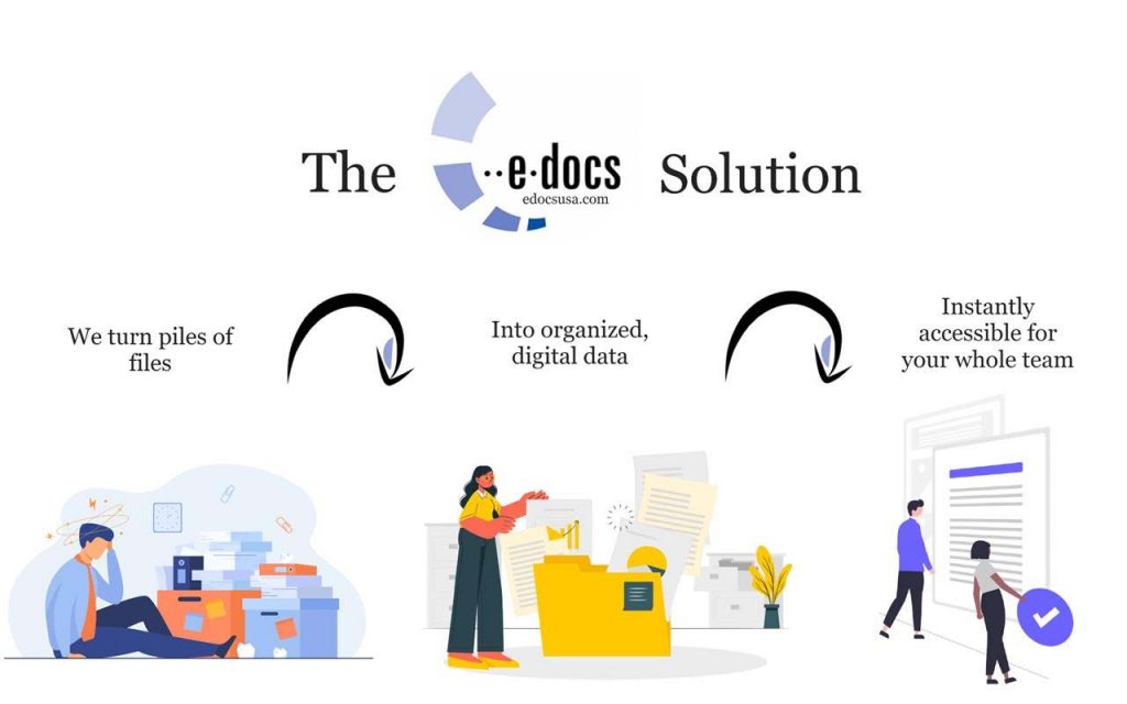 Worried about data security? Have too many folders? Difficulty finding important files? Wanting to organize data but worried about the time and expense? Enter: The e-Docs Solution. We turn piles of files into organized, digitized databases which are instantly accessible for your whole team.